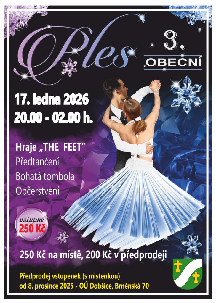 Srdečně zveme všechny obyvatele na 3. obecní ples, který se uskuteční 17. ledna 2026 od 20:00 hodin. K tanci a poslechu zahraje skupina „THE FEET“. Na programu bude také předtančení a bohatá tombola, která potěší všechny účastníky. Vstupenky s místenkou je možné zakoupit od 8. prosince 2025 na obecním úřadě v Dobšicích, Brněnská 70. Nezmeškejte tuto jedinečnou příležitost k setkání a zábavě.