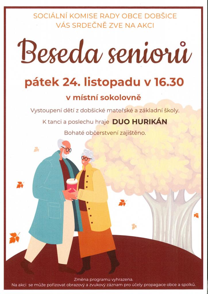 Beseda pořádaná sociální komisí RO se uskuteční od 16.30 hod. v místní sokolovně. V kulturním programu vystoupí děti dobšické mateřské a základní školy, k tanci a poslechu zahraje Duo Hurikán.