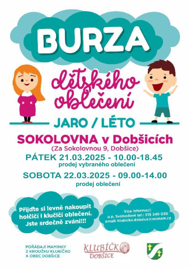 Burza dětského oblečení jaro/léto pořádaná maminkami z kroužku klubíčko a Obcí Dobšice.