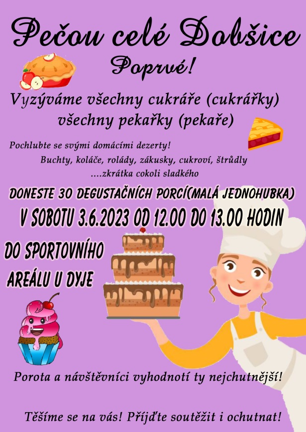 U příležitosti oslavy 30 let osamostatnění Dobšic vyhlašuje obec Dobšice soutěž o dobšický dezert v sobotu 3. června 2023 ve sportovním areálu. Upečte a pochlubte se svým nejlepším zákuskem.
